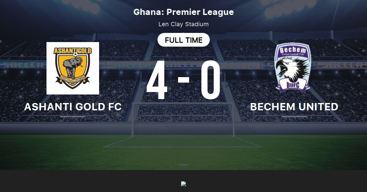 Ashanti Gold FC 0-1 Bechem United FT. Maç Ashanti Gold Sporting Club galibiyetiyle 4 - 0 sona erdi. Ashanti Gold Ashanti Gold vs Bechem United Head to Head Overall Total.